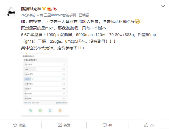 近日,知名数码博主 @秃然熊猫 发布消息,给我们带来了更多关于小米MIX 4的信息。据了解,小米MIX 4将只有一个版本,并没有旗舰版,其将采用6.67英寸华星光电定制的1080p+双曲面屏幕,因而得以实现屏下摄像头。配置上,小米MIX 4将搭载高通骁龙888 Plus芯片,内置5000mAh的电池,支持120W以上有线快充以及70-80W左右的无线快充,后置三摄,其中主摄为50MP的三星GN1s,整机重量约为226g左右,价格可参考小米 11 Ultra。