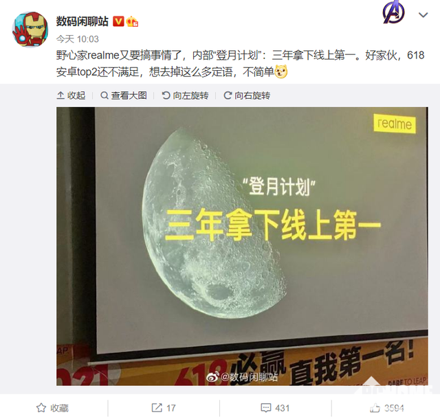 让我们把时间拨回一个月前。618之后的内部庆功会上,realme提出了一个“登月计划”:三年拿下线上第一。要知道,过去三年,“线上第一”一直都被荣耀把持,以“登月”命名的这份计划,无疑昭示了realme的野心。