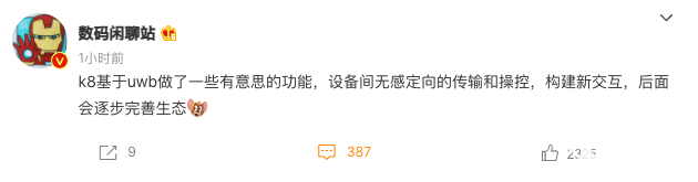 知名数码博主 @数码闲聊站 表示,K8(小米MIX 4代号)基于UWB做出了一些独特的功能,能令设备间无感定向的传输和操控,构建出一种全新的交互方式。这也意味着,小米MIX 4将成为首款搭载“一指连”技术的小米手机。