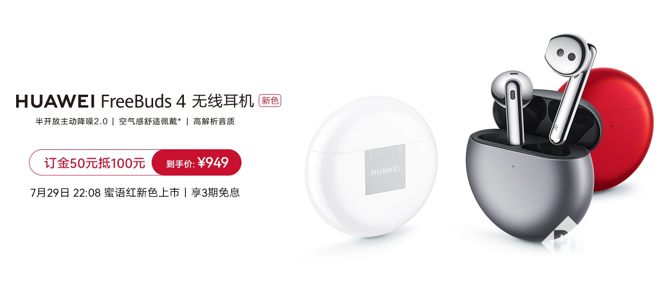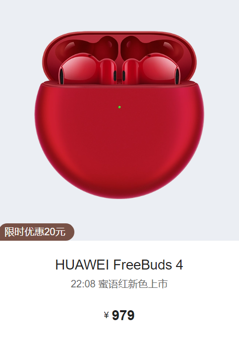 7月29号消息,在今年5月份发布的华为FreeBuds 4无线耳机将在今晚10点08分上市新配色——蜜语红,订金50元抵100元,到手价949元,购买还可享受3期免息。