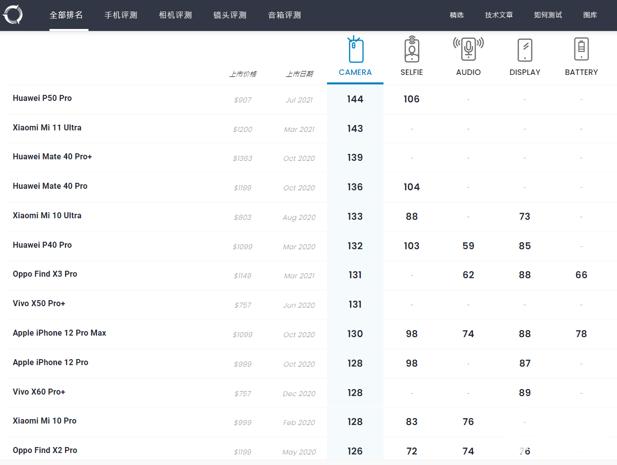 知名拍照评测网站DxOMark给我们带来了华为P50 Pro的拍照成绩。细节方面,华为P50 Pro的摄像头总分为144 分,位列DXOMARK摄像头排行榜第一;自拍总体分数为106,同样在DxOMark前置摄像头排行榜上拔得头筹。