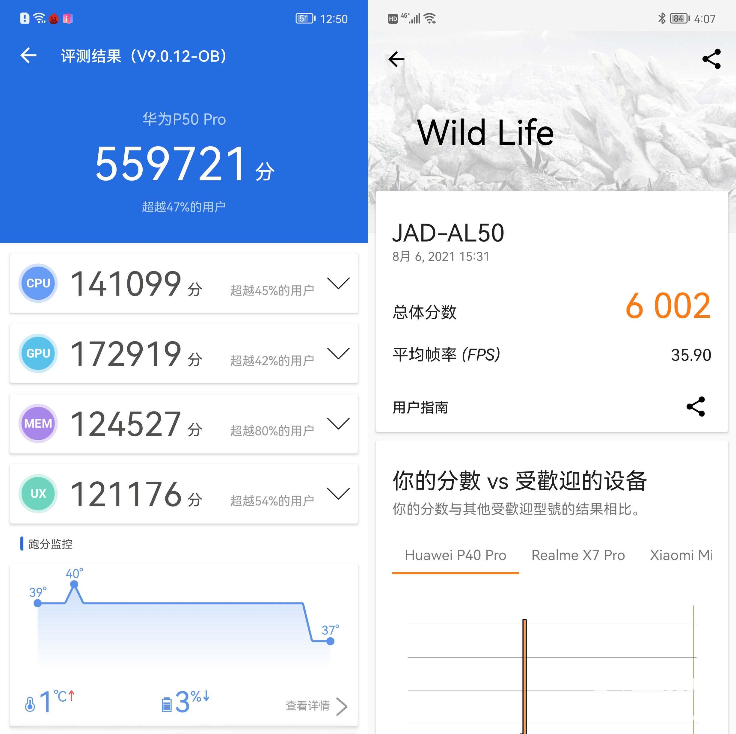 根据跑分测试,与此前搭载麒麟9000芯片的手机比较,华为P50 Pro的性能表现有了一定的提升。在安兔兔的跑分测试中,华为P50 Pro取得了55.9万分的成绩;在3DMark的Wild Life测试中,华为P50 Pro取得了6002分的成绩。总的来看,华为P50 Pro的性能绝对处于当今旗舰机市场的第一梯队。