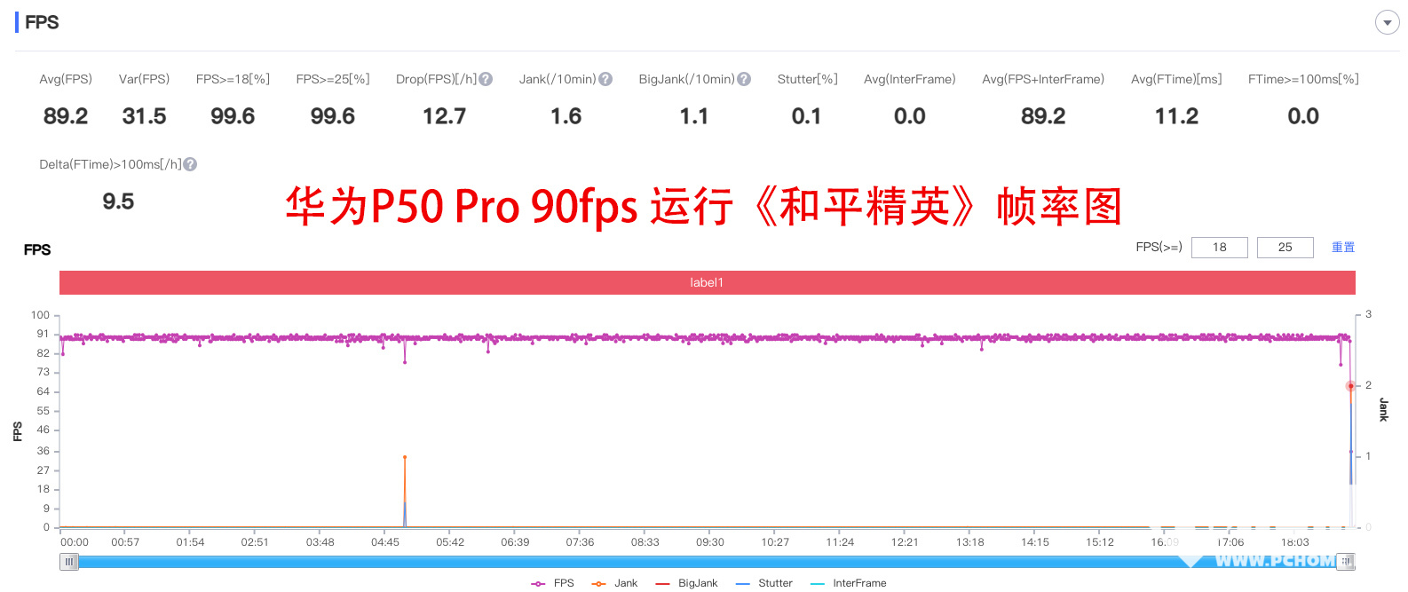 首先,我们先让华为P50 Pro高帧率运行《和平精英》。从帧率图来看,华为P50 Pro几乎可以全程90帧满帧运行《和平精英》,即使复杂的团战也没有出现掉帧的现象。