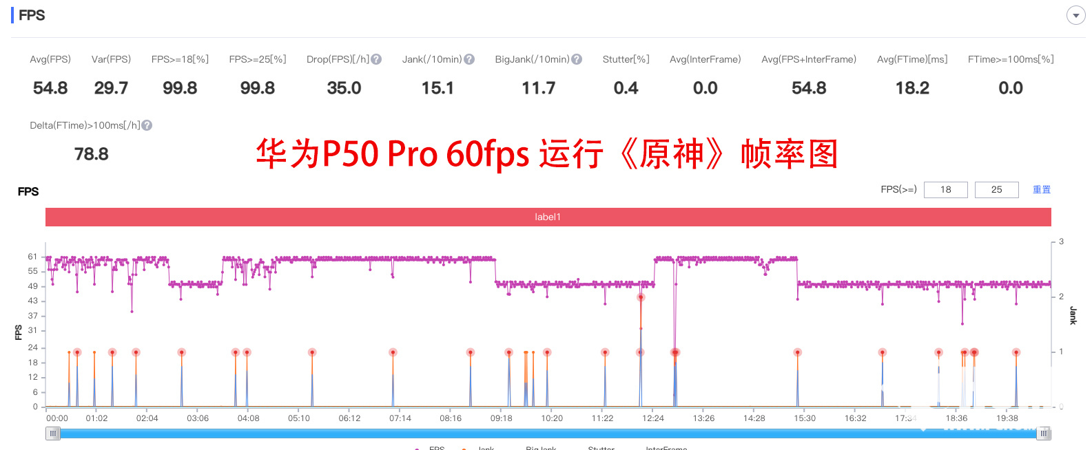 既然《和平精英》是小儿科,那么我们就直接让华为P50 Pro运行当今手游界公认的“性能杀手”《原神》。从帧率图来看,华为P50 Pro在《原神》的开始和中局阶段可以保持在60帧,而在游戏一段时间后,则会掉到了60帧,不过整体来看,华为P50 Pro运行原神的平均帧率依然保持在了54.8,考虑到市面上还有很多旗舰手机不能高帧率运行《原神》,因此,华为P50 Pro能取得这一成绩,实属不易。
