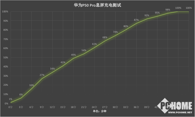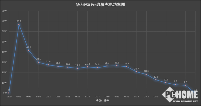 而从功率图来看,虽然华为P50 Pro支持最高66W有线超级快充,但是其充电功率仅在开始充电的第3分钟飙到了66.8W,随后充电功率就一直下跌,徘徊在了25W左右。因此,希望华为未来通过系统更新,适当提升华为P50 Pro的充电功率,进一步缩短整体的充电时间。