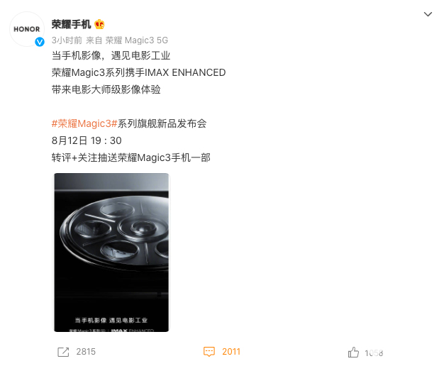 值得注意的是,8月10日,荣耀官微还在微博透露:“当手机影像,遇见电影工业,荣耀Magic3系列携手IMAX ENHANCED,带来电影大师级影像体验”。并配了一张多摄模组的照片,这无疑进一步昭示了荣耀Magic3系列的相机将有革命性的功能。