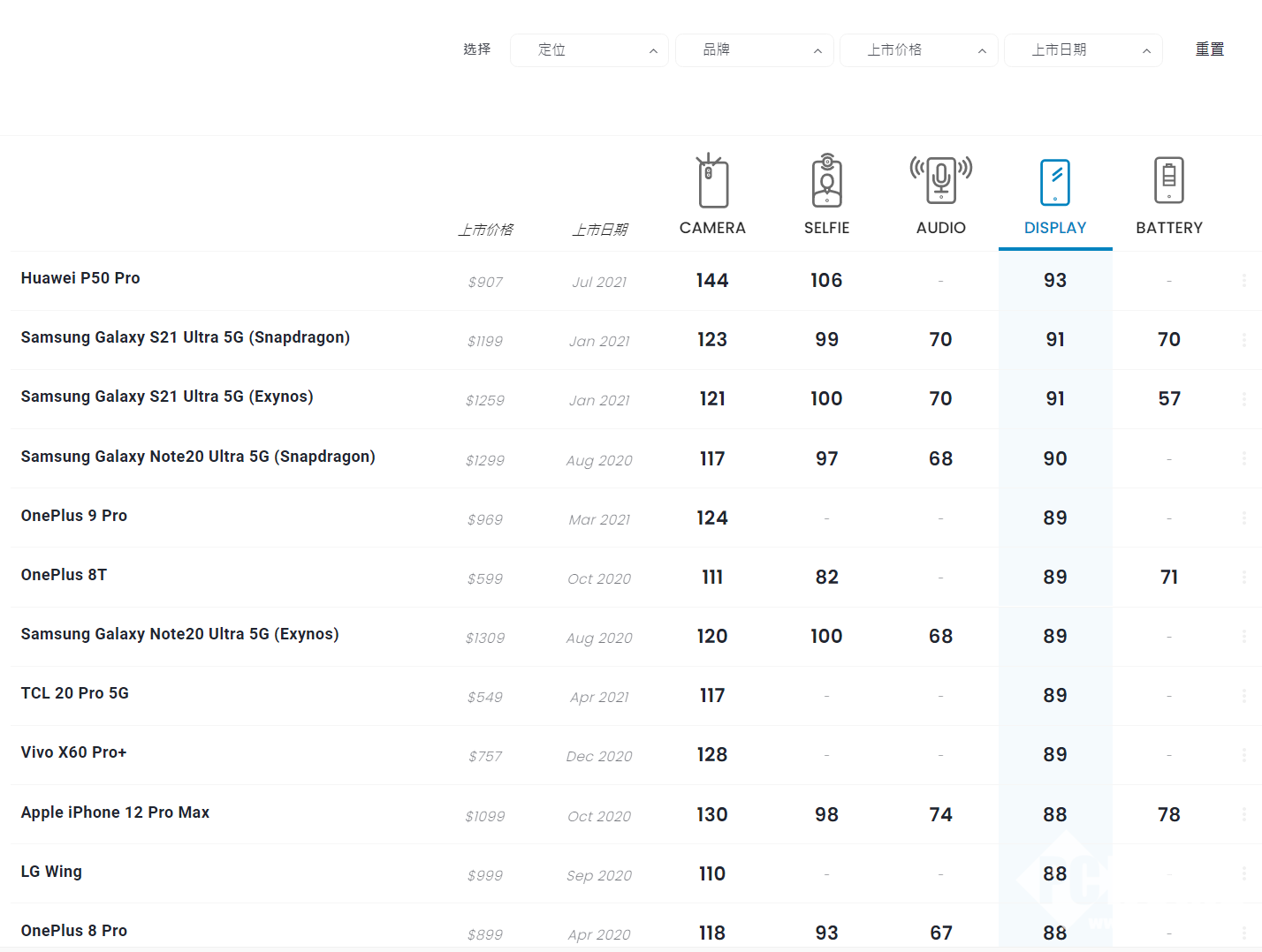 DxOMark数据显示,华为P50 Pro的屏幕得分为93分,远超三星Galaxy S21 Ultra 5G的91分以及一加 9 Pro的89分,位居DXOMARK屏幕榜单第一名。