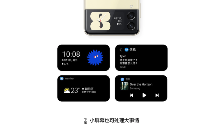 经过重新设计的三星Galaxy Z Flip3 5G外屏,其尺寸是上一代的4倍 ,令用户无需展开手机,亦可查看通知和消息。同时,此次的外部屏幕支持小组件功能,用户可以更便捷地查看天气和步数统计等,轻松掌握日程安排。对于喜欢个性化的用户来说,三星Galaxy Z Flip3 5G 还可将外屏壁纸设置成和三星Galaxy Watch4或三星Galaxy Watch4 Classic匹配的风格,从而带来更加整齐划一且富有视觉冲击力的视觉效果。当然,用户也可以通过外部屏幕使用三星智付功能完成日常支付。