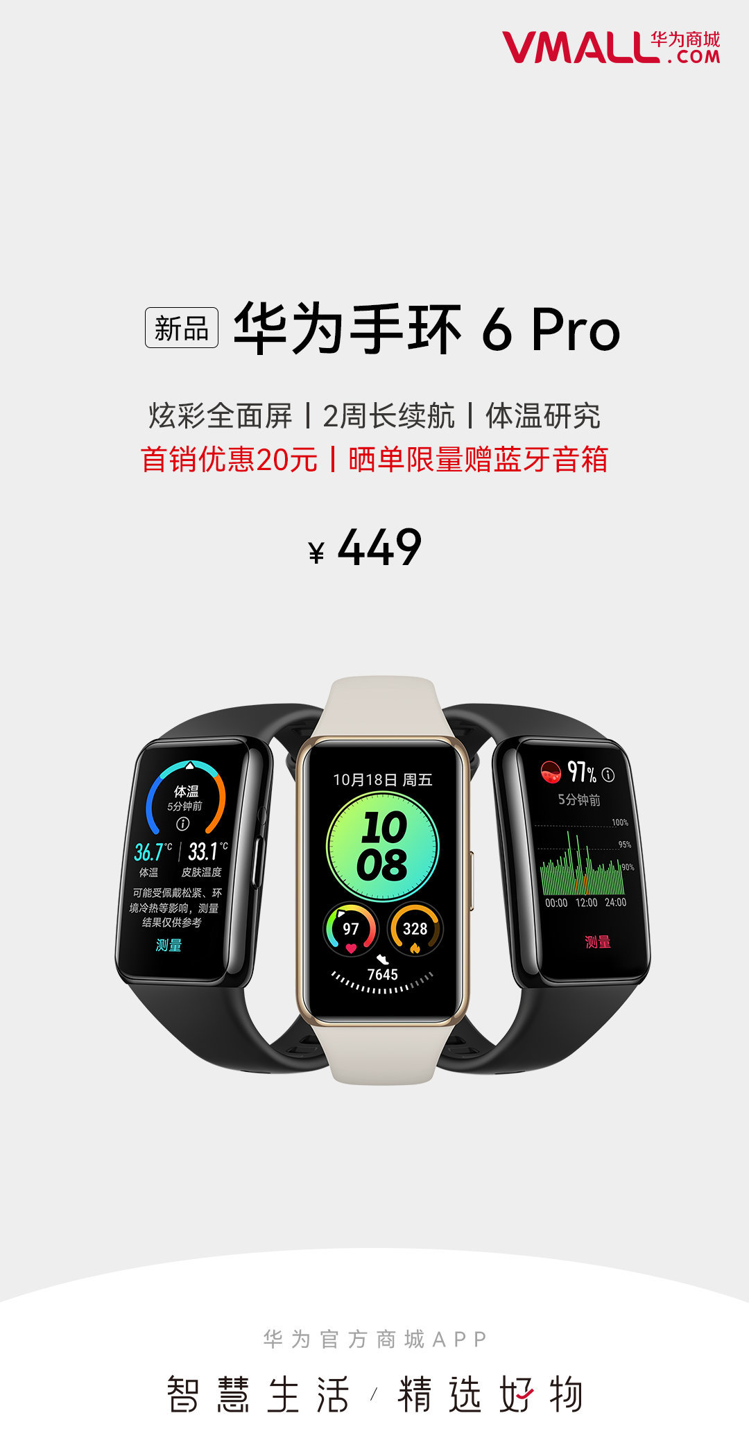 8月20号消息,此前发布的华为新款手环产品——华为手环6 Pro已于0点开启首销,售价449元,限时优惠20元,晒单更有限量好礼相赠。华为手环6 Pro搭载炫彩全面屏,支持2周长续航,可以进行体温研究。