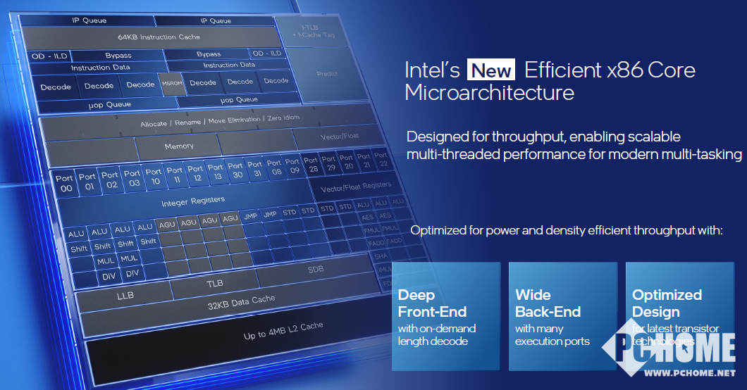 此高能效x86微架构在有限的硅片空间实现多核任务负载,并具备宽泛的频率范围。该架构致力通过低电压能效核降低整体功率消耗,为更高频率运行提供功率热空间。这也让能效核提升性能,以满足更多动态任务负载。