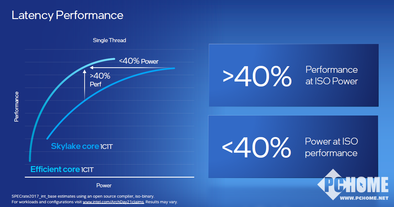 相比英特尔最多产的CPU内核Skylake,在单线程性能下,能效核能够在相同功耗下实现40%的性能提升,或在功耗不到40%的情况下提供同等性能。与运行四个线程的两个Skylake内核相比,四个能效核所提供的吞吐量性能,能够在功耗更低的情况下同时带来80%的性能提升,而在提供相同吞吐量性能时,功耗减少80%。