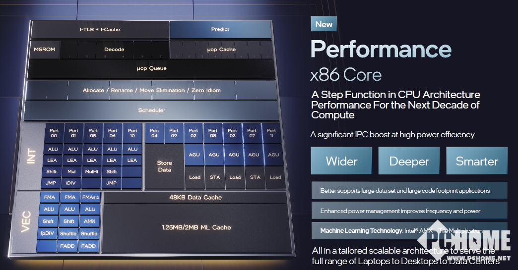 性能核是英特尔有史以来构建的性能最高的CPU内核,并通过以下功能突破了低时延和单线程应用程序性能的极限。相比目前的第11代英特尔酷睿处理器架构(Cypress Cove),在通用性能的ISO频率下,针对大范围的工作负载实现了平均约19%的改进。另外搭载英特尔高级矩形扩展(AMX),内置下一代AI加速提升技术,用于学习推理和训练。AMX包括专用硬件和新指令集架构,以明显提高矩阵乘法运算,减少时延,对大型数据和代码体积较大的应用程序提供更好的支持。