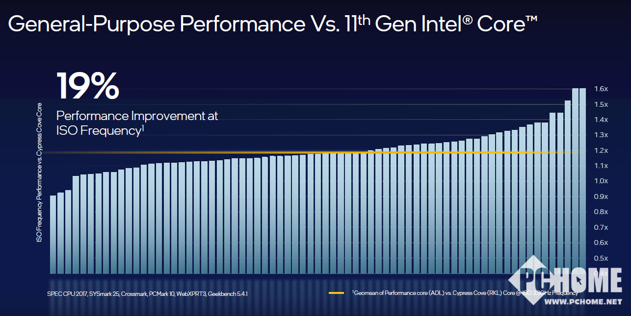 英特尔全新性能核微架构,曾用代号 “Golden Cove”,旨在提高速度,突破低时延和单线程应用程序性能的限制。全新性能核微架构拥有更宽、更深、更智能的架构:带来了显著增速同时更好地支持代码体积较大的应用程序。