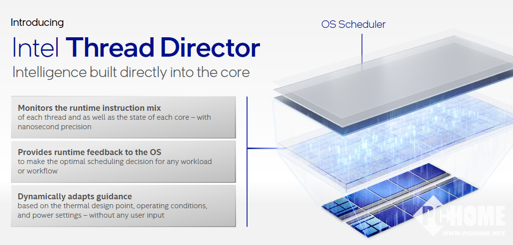 特别的是,为了使性能核和能效核与操作系统无缝协作,英特尔开发了一种改进的调度技术,称之为“英特尔硬件线程调度器”。硬件线程调度器(Intel Thread Director)直接内置于硬件中,可提供对内核状态和线程指令混合比的低级遥测,让操作系统能够在恰当的时间将合适的线程放置在合适的内核上。