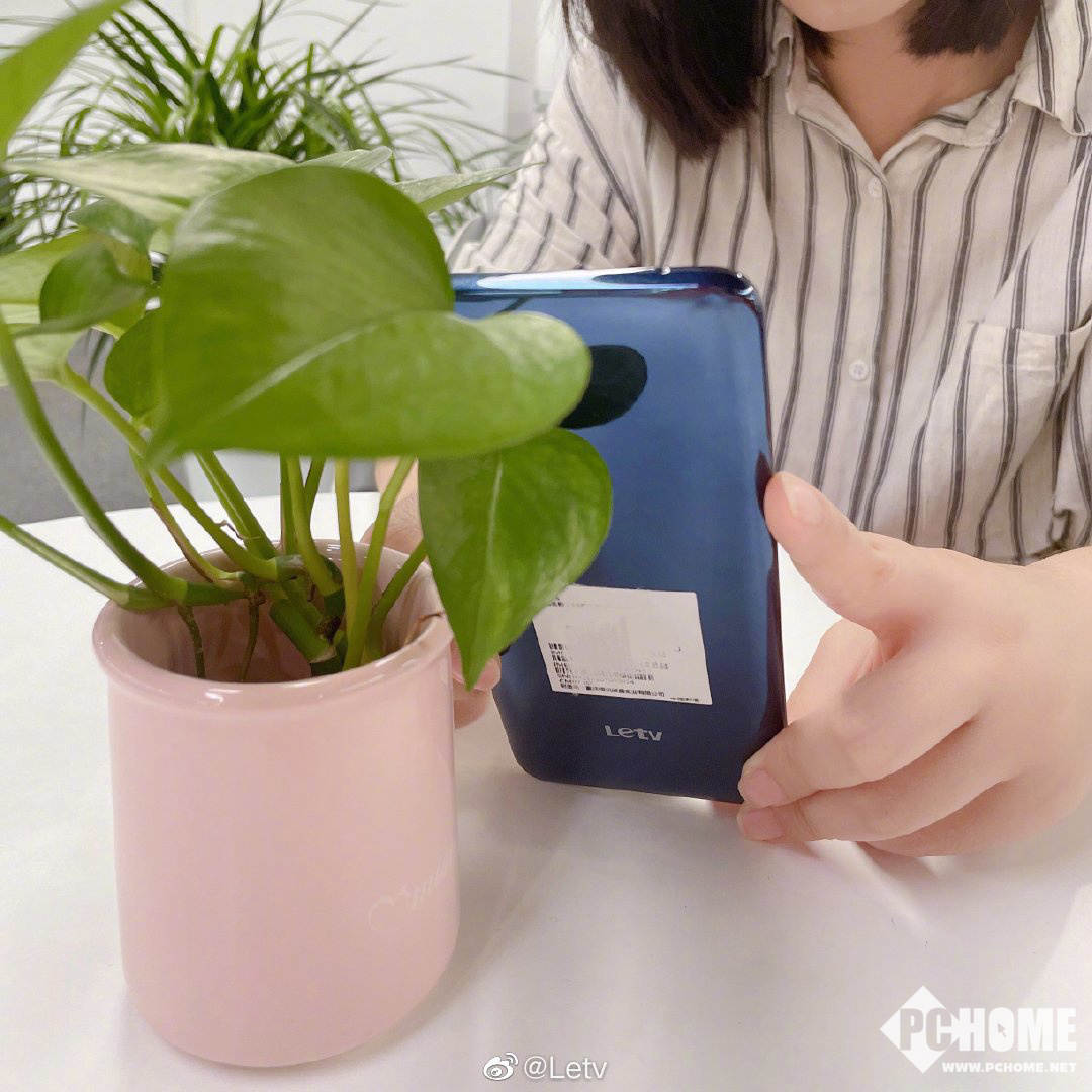 细节方面,乐视超级手机的机身正面将会采用水滴屏设计,背部印有“Letv”的logo,整机配色为宝蓝色。遗憾的是,由于被绿植挡着,我们很难看清乐视超级手机的摄像头信息。