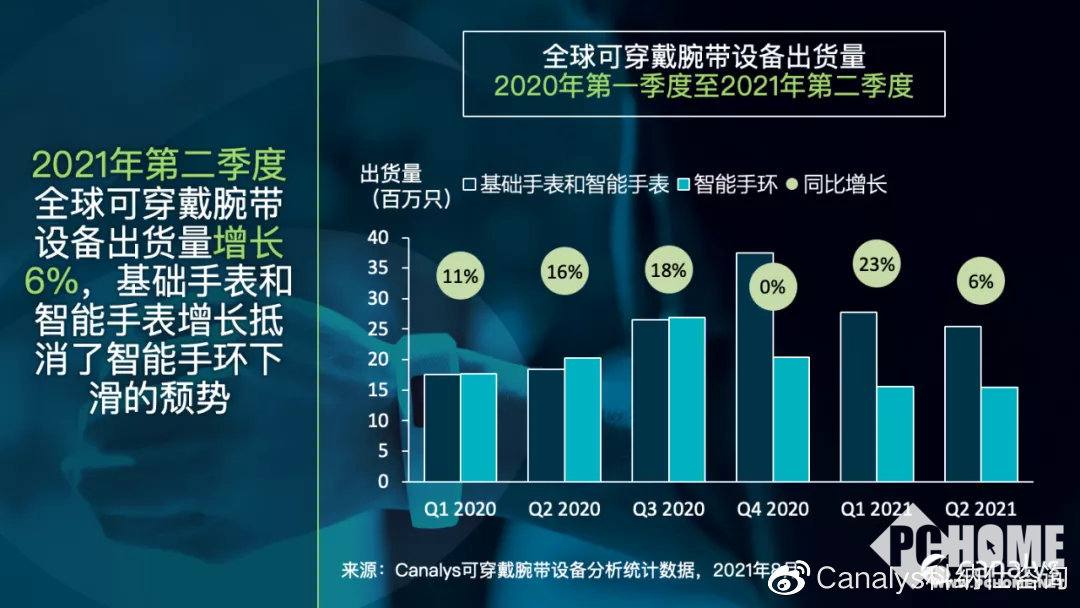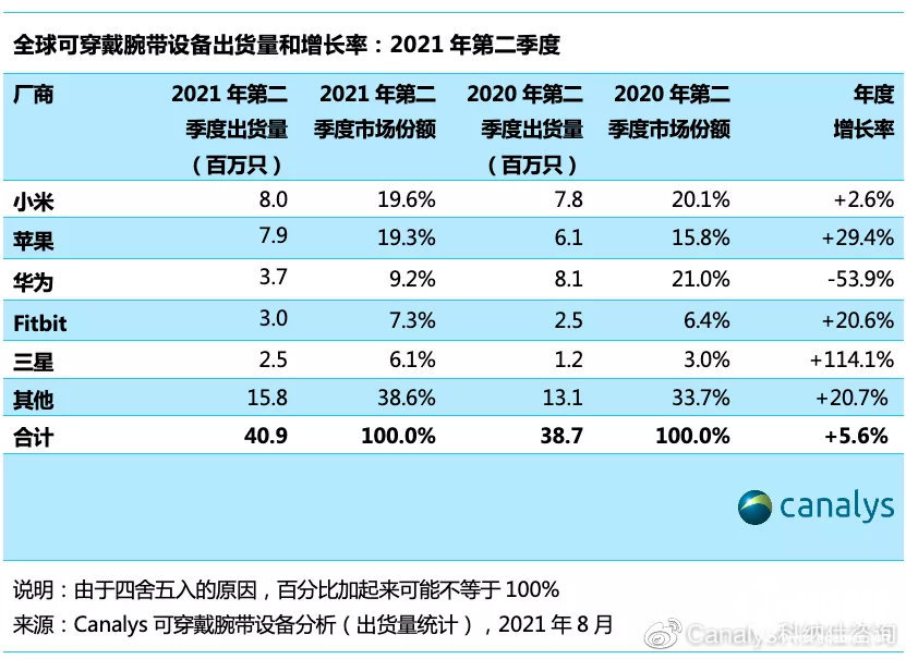 近日,知名数据调研机构Canalys发布《2021年第二季度全球可穿戴设备市场报告》,数据显示全球可穿戴腕带设备市场同比增长5.6%,出货量达到 4090万只。