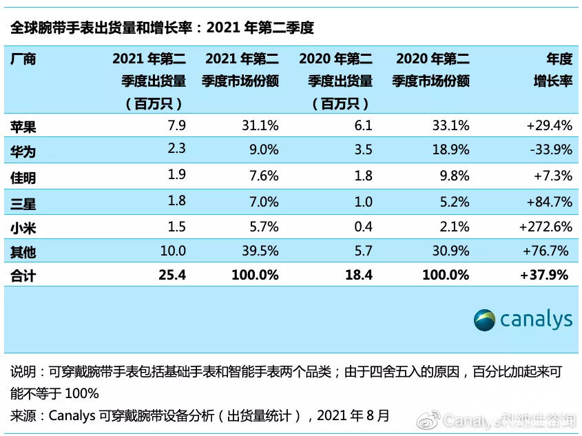 手表市场中,苹果继续引领全球腕带手表市场, 2021年第二季度以31.1%的市场份额遥遥领先。华为以230万只和9.0%的市场份额位居第二。