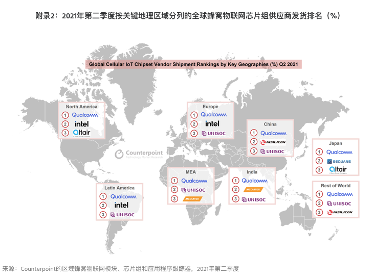 市场占比方面,高通仍旧是全球蜂窝物联网模块的领军企业,占据了近一半左右的市场份额。华为海思和紫光展锐分别位列第二、三名位置。Counterpoint表示NB-IoT占HiSilicon发货量的90%以上,并预计将在未来将NB-IoT的领导地位移交给竞争对手UNIOC。UNIOC是本季度同比增长超过100%的前五大蜂窝物联网芯片组播放器中唯一的一家。最近的模块发布趋势显示,UNIISOC正更专注于NB-IoT和4G Cat 1。Quectel、Neoway、Longsung和Open Luat是本季度推出基于UNISC的模块的一些著名玩家。此外,UNIOC于8月推出了第16版,支持5G芯片组平台V516。预计它将帮助UNIOC在制造、港口监控、电网监控、远程医疗和患者监控等5G应用程序中增加市场份额。”