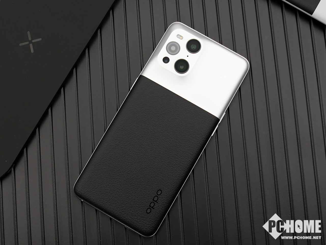 在机身的下半区域,则是黑色的素皮材质机身,素皮材质的优势在于手感好并且重量低,皮质的独特纹理视觉效果也相当优秀,与上部区域的金属质感玻璃形成最明显的对比,使得OPPO Find X3 Pro摄影师版层次感十足。