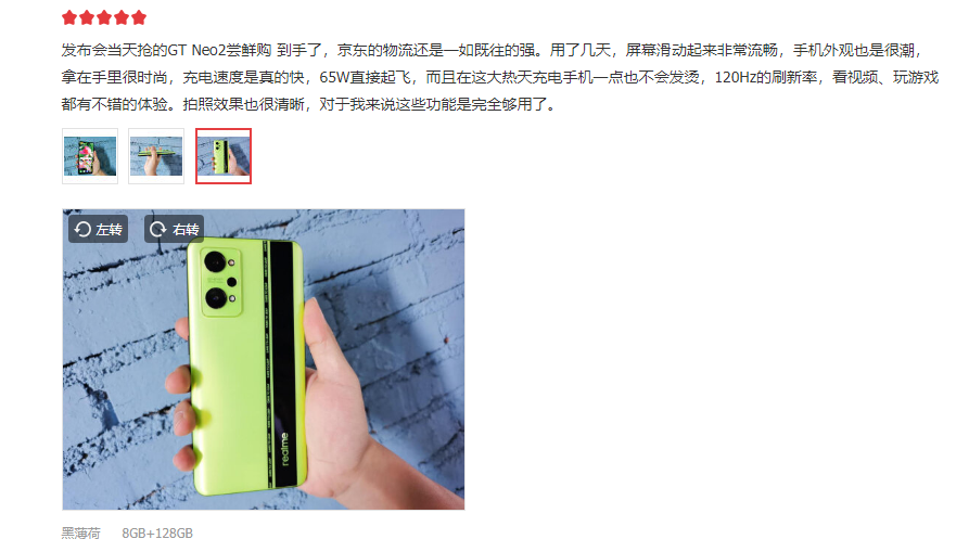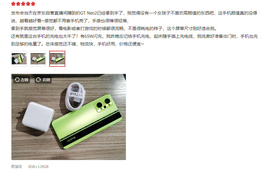 在这些林林总总的评论中,“颜值真的没得说”、“拿在手里很时尚”、“背面很有设计感”等等,几乎所有用户都对新品的外观表示一致认可。与此同时,新品的强悍性能也打动了所有消费者,“用它玩了一下午游戏真的非常流畅”、“看电影或者打游戏的时候都很流畅,不是很耗电的样子”、“120Hz的刷新率,看视频、玩游戏都有不错的体验”,同时也顺带表示了续航能力非常突出,可见真我GT Neo2在用户心中已经初具好感,大卖看来只是时间问题。