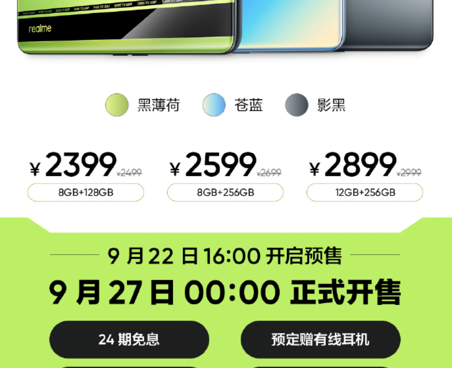 产品方面,真我GT Neo2此次带来黑薄荷、影黑、苍蓝三款配色,其中黑薄荷版本采用全新设计语言,从机能美学中汲取灵感,用大胆、冲击力极强的拼接撞色承袭GT视觉基因。