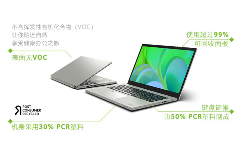 宏碁蜂鸟・未来最大的产品亮点是在材料选择上面,机身外壳采用PCR再生材质打造。其中机身和屏幕边框使用了30%的PCR塑料,键盘部分采用了50%的PCR塑料。PRC塑料是从废弃的制品中重新制造而来,有助于减少对于化石燃料的消耗。另外机身表面还覆盖着无挥发性的有机材料。