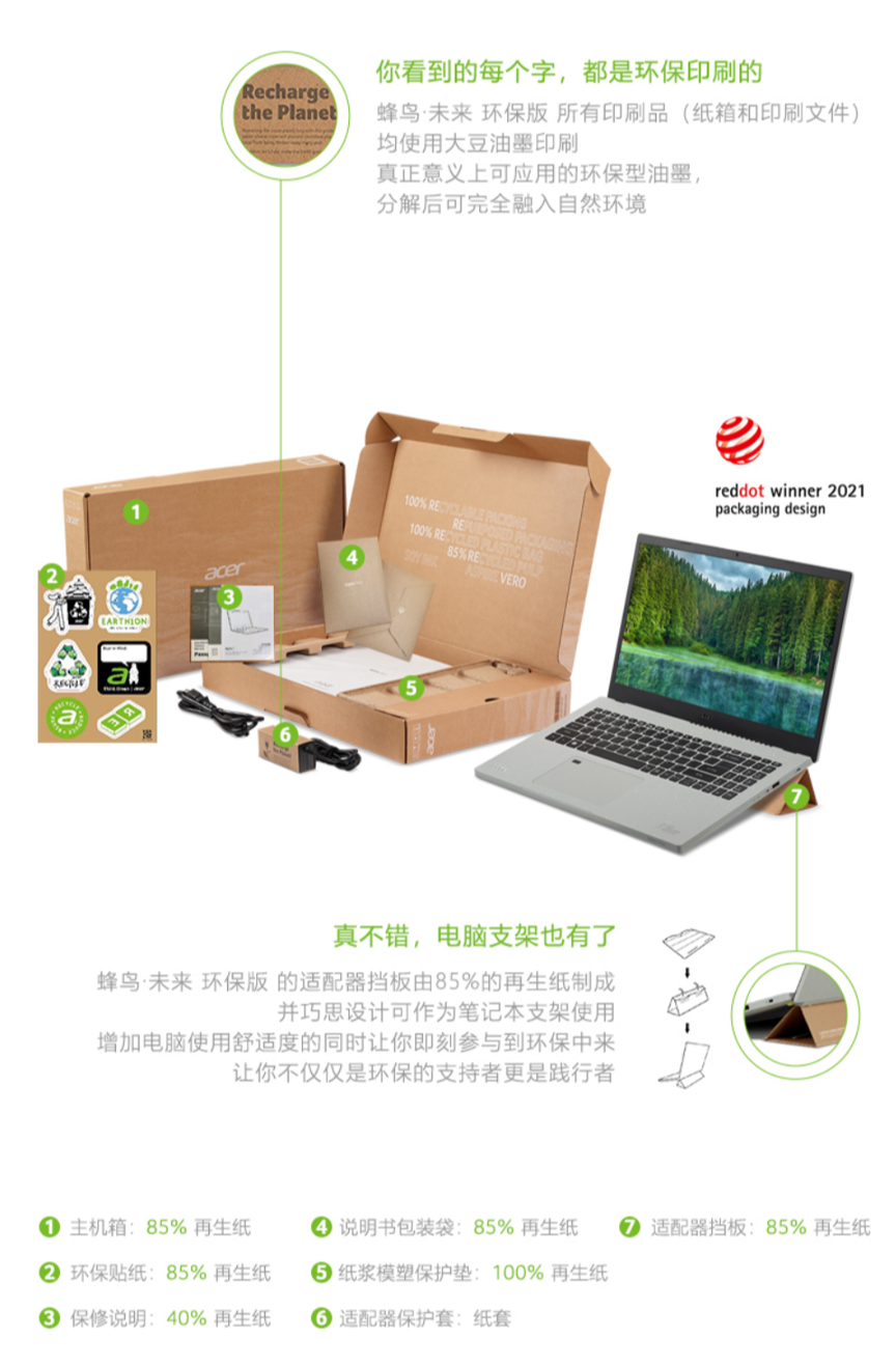 另外,宏碁蜂鸟・未来的包装盒也是采用再生纸环保材料制成,并且使用了大豆油墨印刷,更加便于分解。