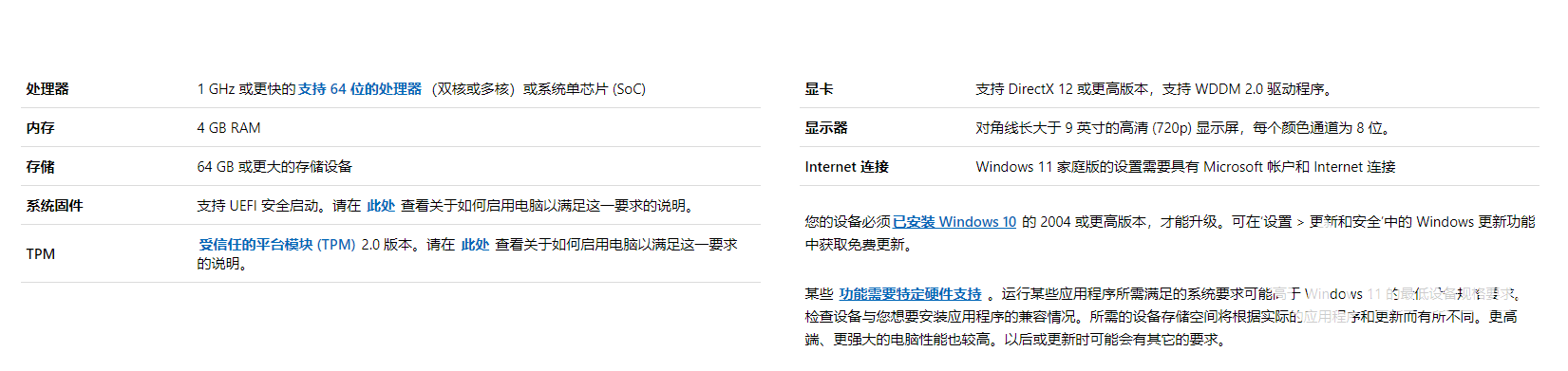 在升级之前,用户可以在微软官网查看Windows 11系统的硬件要求:处理器需要是频率在1GHz以上的双核或多核64位处理器,显卡需要支持DX 12和WWDC 2.0,内存需要在4GB以上,硬盘容量支持64GB,安全性方面需要支持TPM 2.0。