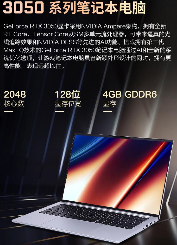 机械革命F1独显版搭载RTX 3050显卡,该显卡采用4GB GDDR6线程,流处理器数量可达2048个,基于8m制程打造,工作频率为1237MHz-1500MHz。