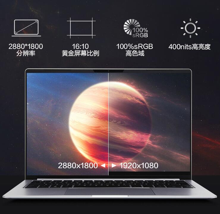 机械革命F1独显版的机身镁铝合金材质打造,机身重量仅为1.1kg。屏幕尺寸为14英寸,屏幕分辨率为2880×1800,支持90Hz高刷新率,覆盖97% sRGB色域,屏幕亮度为400尼特。