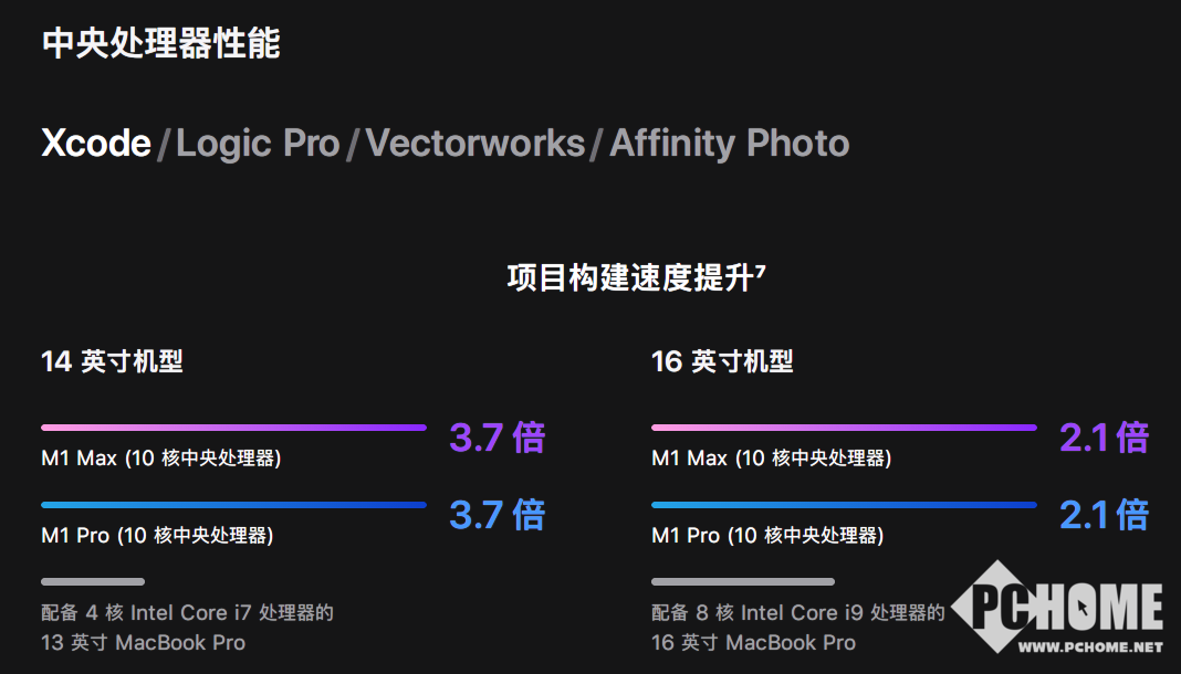 连自家的产品都吊打了,与Intel相比,那更是一点也不客气。如果与配备4核英特尔酷睿i7处理器的上一代13英寸MacBook Pro相比,新的14英寸MacBook Pro性能最高可达其3.7倍;如果与配备8核心酷睿i9处理器的上一代MacBook Pro 16相比,新的16英寸MacBook Pro性能最高可达其2.1倍。