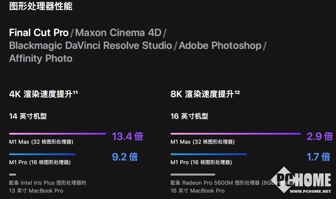 至于GPU图形性能,M1 Pro与M1 Max更是成倍地增加,与搭载集成Iris Plus图形处理器的英特尔酷睿i7处理器的13英寸MacBook Pro相比,M1 Max的GPU性能足足提升了13倍。即使是与配备AMD Radeon Pro 5600M独显的16英寸MacBook Pro相比,在Final Cut Pro的8K渲染中也有着2.9倍的性能提升。
