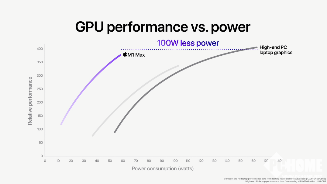 可怕的还在后面:同样的性能下,苹果M1 Max芯片的功耗要比搭载高性能移动GPU的PC低了100W,即使是在使用电池的时候,性能发挥依然火力全开。诚然,M1系列芯片基于ARM架构打造,在功耗方面与x86构架相比有着天生的优势,但M1 Max的能耗比也实在是夸张,与X86相比简直是降维打击。