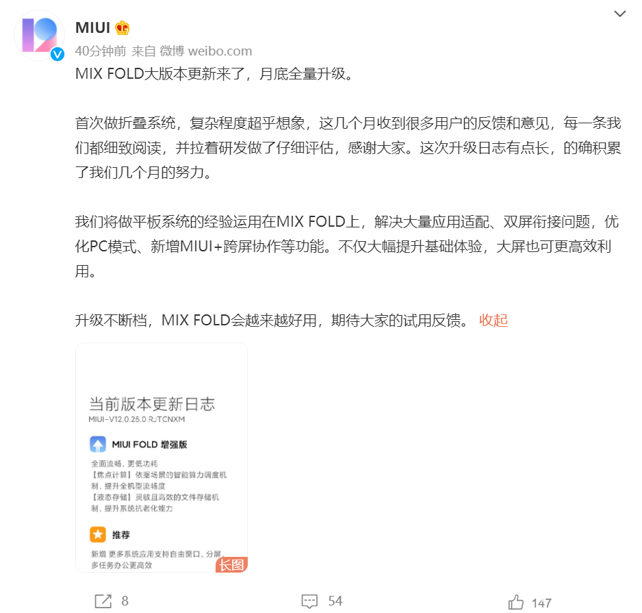 MIUI 官方微博宣布,小米MIX Fold折叠屏手机的大版本更新来了,将于月底全量升级。