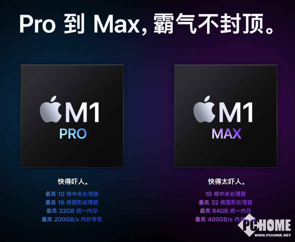 新款MacBook Pro在配置方面的升级最为明显,搭载苹果最新一代自研芯片——M1 Pro和M1 Max。相比于初代的M1芯片 ,新一代芯片在CPU核心数、GPU核心数、统一内存、内存带宽、封装晶体管数量等关键参数方面均有成倍的提升。
