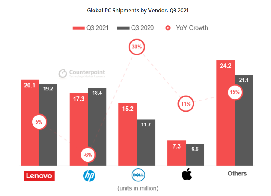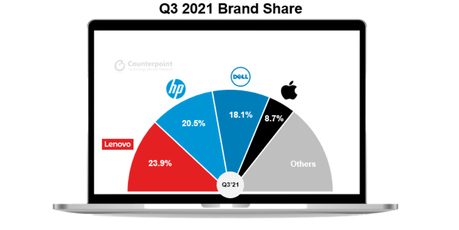 国外知名调查架构Counterpoint在近日公布了2021年第三季度的全球个人电脑销量数据,其中联想、惠普、戴尔、苹果的销售量位居前四,但是惠普销量同比有所下降。