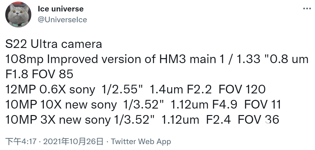 随着2022年的逐渐到来,各家的旗舰产品也都开始蓄势待发。比如有消息称,三星Galaxy S22 Ultra已经开始测试。而近期,我们就见到了三星Galaxy S22 Ultra的相机参数。