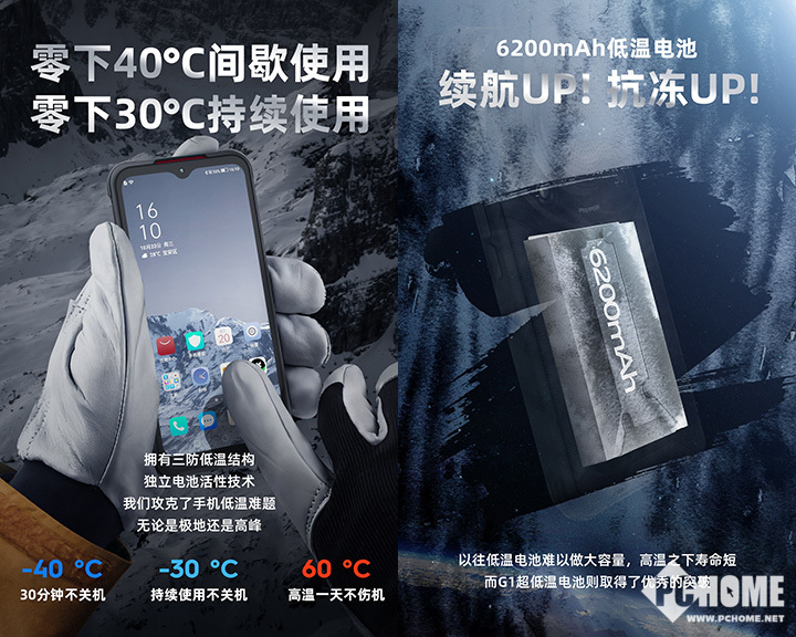 除了户外防护能力,AGM G1的防冻能力也得到了提升。AGM G1支持北极芯电池采用超低温保护技术,能让锂电池抵抗低温,而且不仅能在超低温使用,同时能耐60度的高温。根据官方数据,其内置的6200mAh超低温电池,能在-30摄氏度的环境使用一天,在-40摄氏度的环境也能间接实用。