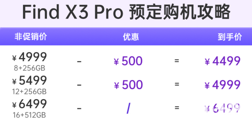 价格方面,预定OPPO Find X3 Pro,8GB+256GB优惠500元,到手价4499元;12GB+256GB优惠500元,到手价4999元;16GB+512GB到手价6499元。