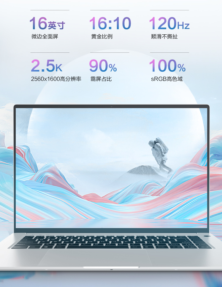 屏幕分辨率为2560×1600,拥有120Hz高刷新率,覆盖100% sRGB色域,屏占比达到了90%。屏幕比例为16:10,更加适合办公。屏幕支持178°展开。