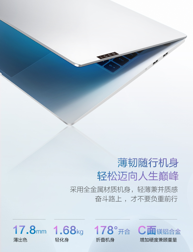 一格IGER Pro 16轻薄本的机身轻至1.68kg,厚度仅为17.8mm,C面采用镁铝合金材质打造。拥有70Wh大容量电池,支持PD快充,同时标配90W DC口电源适配器。