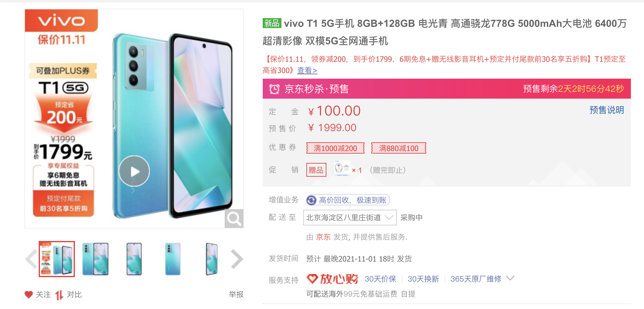 vivo也于双11期间发布全新系列产品,搭载了骁龙778G处理器、LPDDR5、UFS 3.1、120Hz 高刷原色屏、5000mAh大电池、6400万像素三摄等配置,拥有极致流畅体验、持久续航、潮流外观与超清影像等特性,是有颜有料的全新实力担当。vivo T1提供三个版本,已在vivo官网、京东、天猫vivo手机官方旗舰店正式开启预售,预售期间8GB+128GB版本到手价1799元,8GB+256GB版本到手价1999元,12GB+256GB版本到手价2399元。