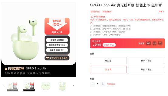 OPPO Enco Air售价为299元,目前参与双十一优惠,10.20-11.13全程价保且限时立减100元,到手价仅为199元。11月1日-13日,每日0点限量抢五折,晒单返3000积分。