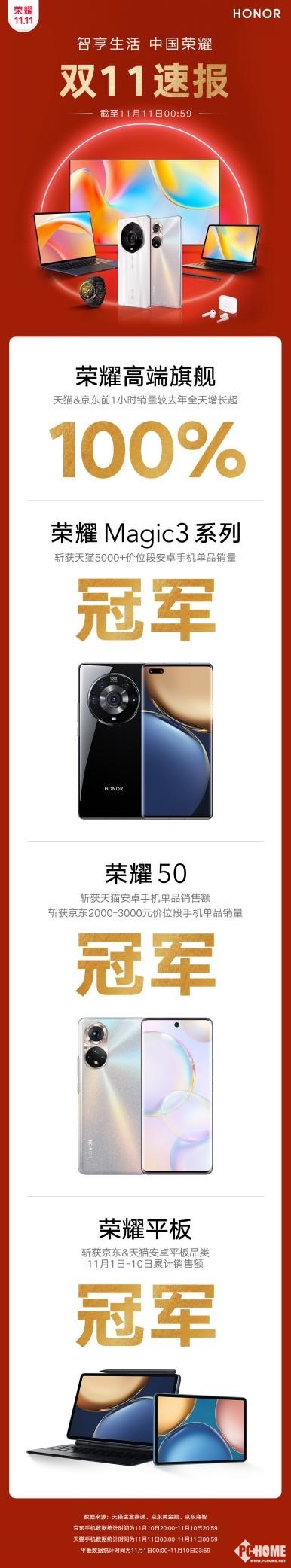 在手机产品之外,荣耀智慧屏、笔记本电脑、平板、智能穿戴等全品类产品在荣耀双11活动中,均有着优秀的表现,荣耀平板就斩获了京东、天猫双平台11月1日-10日的安卓平台累计销售额冠军。荣耀所打造的1+8+N全场景生态作为未来生活方式的趋势,正在被广大消费者所接受。