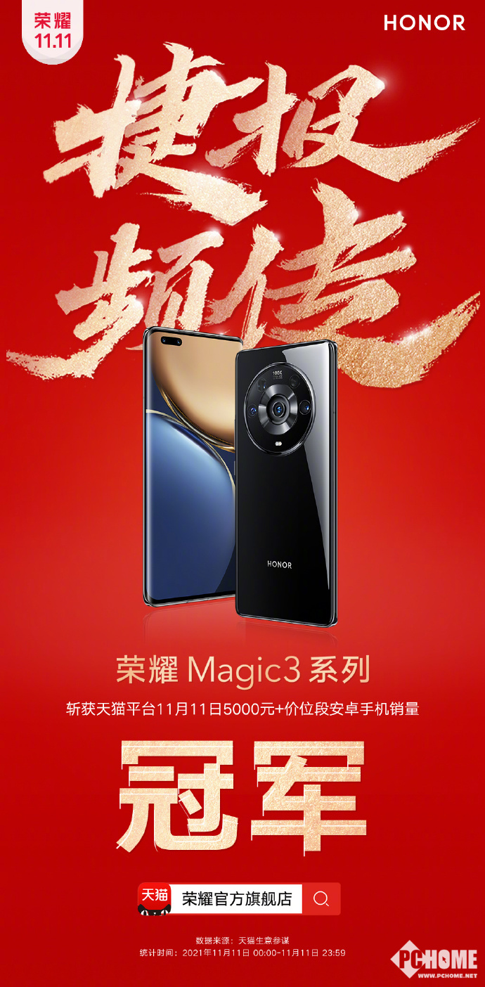 截至11月11日23:59,荣耀Magic3系列摘得11月11日天猫、京东5000元+价位段安卓手机销量冠军。荣耀50获11月11日安卓5G手机单品销量、销售额冠军。