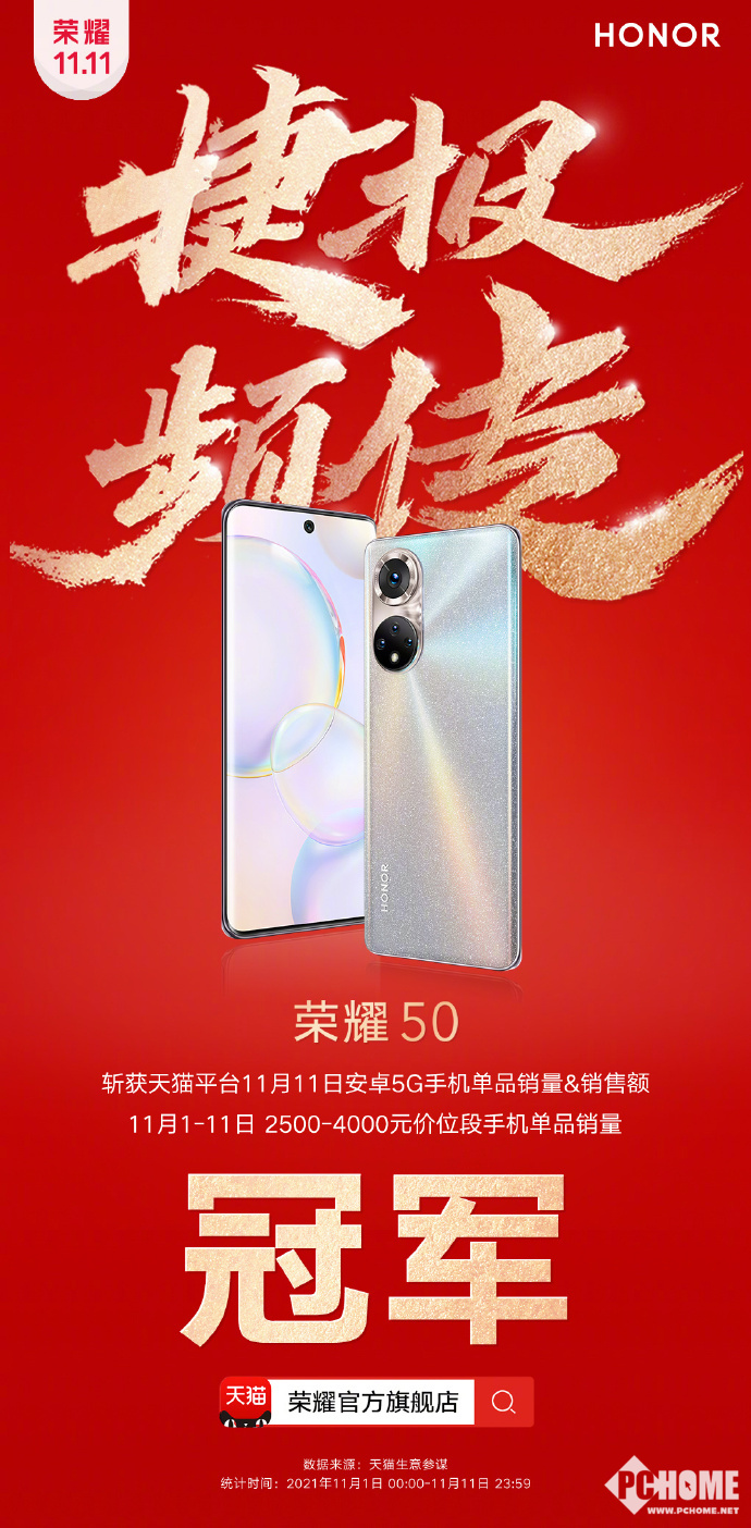 11月12日,荣耀HONOR官方微博发布了双11战报。战报显示,截至11月11日23:59,荣耀高端旗舰手机收官大捷,获得多个冠军。