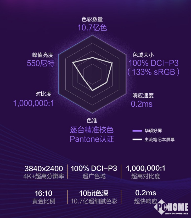 华硕灵耀Pro16搭载一块16英寸4K OLED屏幕,可以满足各类复杂精细化的内容创作任务。首先它在色彩表现方面十分优秀,支持10bit色深,最高可以显示10.7亿种颜色,并且拥有100% DCI-P3色域,每台笔记本都经过逐一校色,并且通过了Pantone色彩认证,色彩覆盖范围更广,色彩显示更加精确。