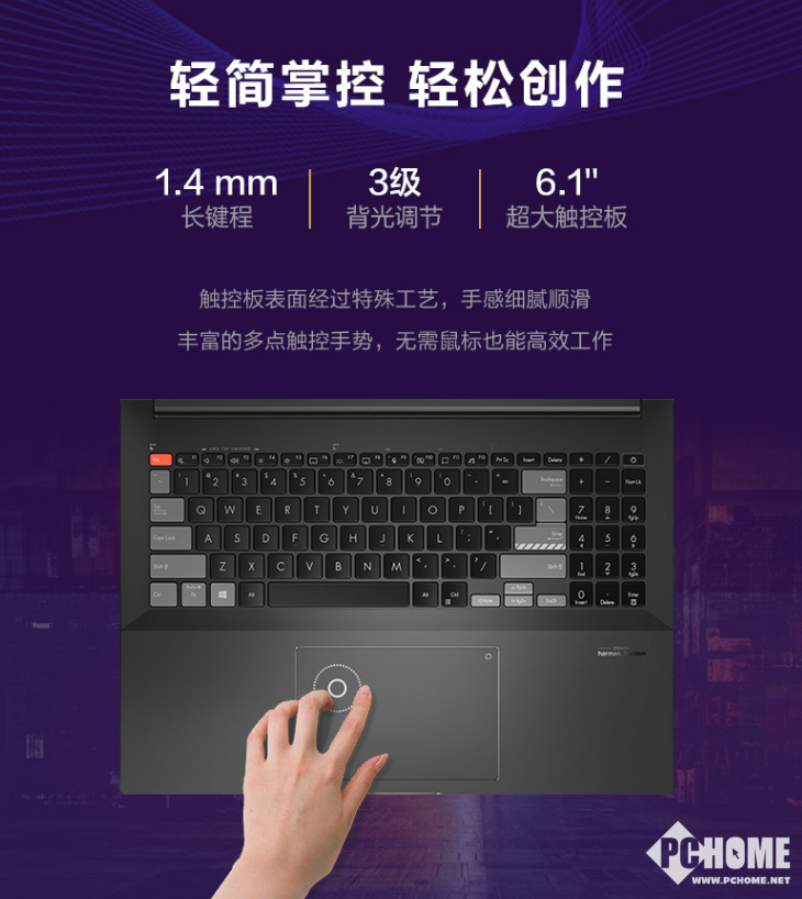 键盘方面,华硕灵耀Pro16的键盘拥有1.4mm超长键程,可以给用户带来极致流畅的输入体验。同时配备了6.1英寸的触控板手感细腻丝滑,触控支持Dial Pad虚拟旋钮功能,可以实现笔刷设置和色彩调节等功能,大幅提升内容创作者的工作效率。