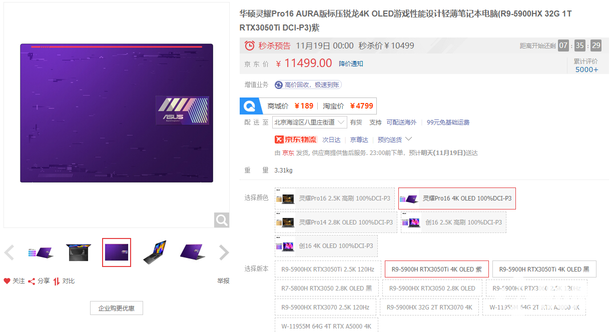 华硕灵耀Pro16可以称得上2021年度值得重点关注的生产力工具,搭载了16英寸4K OLED屏幕,拥有更出色的色彩表现、更高的亮度和对比度、更低的响应时间。同时搭载R9 5900HX处理器和RTX 3050 Ti独显。11月19日秒杀价仅需10499元。