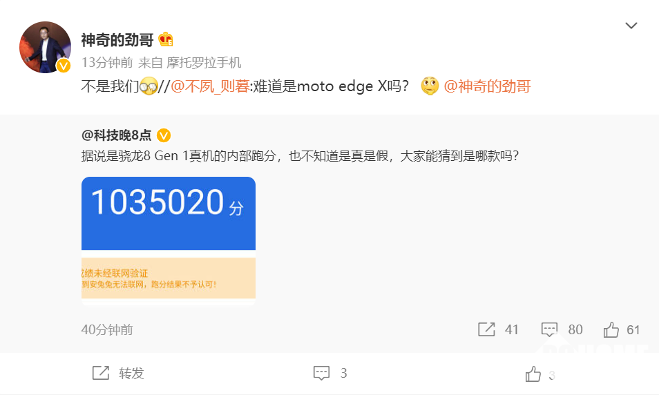 近日,微博用户 @科技晚8点 曝光了搭载骁龙8 Gen1处理器新机的安兔兔App跑分,结果跑分成绩破百万,高达1035020分,相比高通888 Plus的80万分有了明显提升。